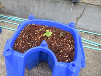 学校に帰ってきて見たら,星の子の1年生の朝顔に,小さなフタバが出ていました。