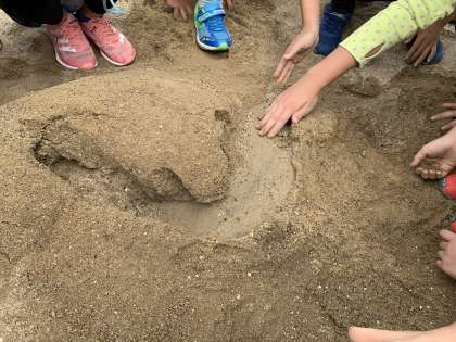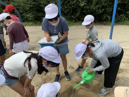 理科の学習で「流れる水のはたらき」の学習をしています。久しぶりの砂場での活動ということで,低学年の頃,いや,もっと前を思い出したかのような楽しそうな姿が見られました。はしゃいでばかりかと思われるかもしれませんが,そこはさすが5年生。学習にもしっかりと意識を向けていて,「水の流れがカーブのところで変わった。」などといった気づきも多くありました。