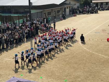 1年生の集団活動は『とびあそびリレー』です。ただのリレーではありません。フープを跳び,箱を飛び越し,コーンをジグザク走り,そしてここからが難所,ビニールシートにドッジボールをのせて落とさないように4人で心を合わせてゴールに向かいます。一人だけ速く走ってもゴールはできません。それぞれのチームがボールを落とさないように工夫してゴールをめざしました。