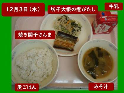 12月3日(木)の献立は,麦ごはん,牛乳,焼き開干さんま,切干大根の煮びたし,みそ汁でした。焼き開干さんまは,スチームコンベクションオーブンで調理しました。