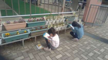図画工作で,春の花を見つけに学校の中をみんなで回りました。