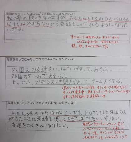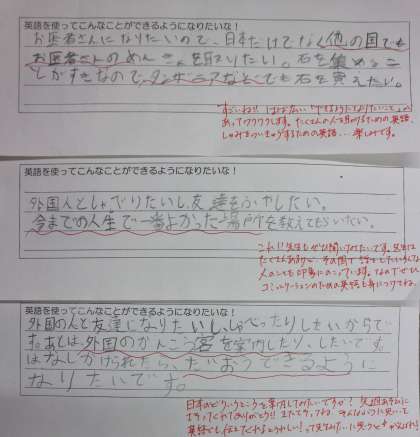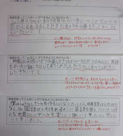 授業を始める前に「英語を使ってどんなことができるようになりたいですか?」と聞いてみました。最初,英語は苦手です・・・と話していた人が多かったですが,授業の様子は花丸!しっかり聞いてたくさん話そうとチャレンジしていました。できるようになりたいことも,夢につながっていたり,世界に目が向けられていたり,人と人とのつながりについて考えられていたりして,感心しました。これからの授業がすごく楽しみです。