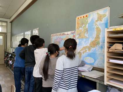 社会科「世界の中の国土」の学習をしています。今日は世界の大陸や海,国などについて学習しました。授業後,掲示されている世界地図や置いてある地球儀を見ながら関心を深めている様子が見られました。覚えることは多いですが,この調子で興味をもって取り組んでくれると嬉しいです。
