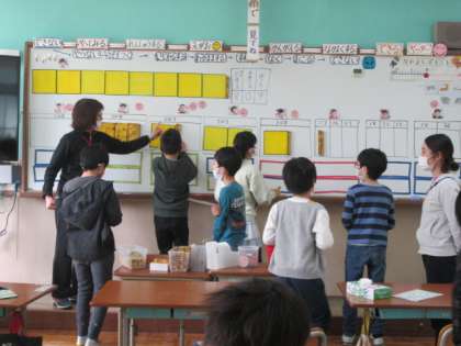 積み木を使って,数量の学習をしています。今日は3桁の数量が登場。「108」「502」など,十の位が0の数量について学びました。「0ってどういう意味かな?」と問いかけると,「”ない”っていうこと!」と答える子どもたち。数の学習,おもしろいですね。