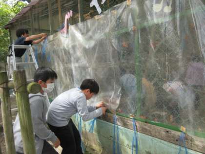 最近,一気に暖かくなってきました。そこで,冬の間寒さからウサギたちを守るために小屋の周りに貼っていたビニールシートを外す作業をしました。ウサギ小屋の風通しが良くなって,ウサギたちも気持ちよさそうでした。ウサギの様子も,外からよく見えるようになったので,可愛いウサギたちを見に来てください。