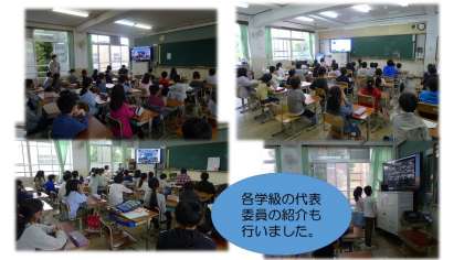 今年度初めての人権・児童朝会を行いました。児童会本部の進行で,まずは児童朝会から行いました。児童会本部から,5月の児童会目標『みんなと仲良しになるために名札をつけよう』を発表しました。名札をつける理由を各学級で考えて再確認し,全校みんなで名札をつけることを頑張ります。また,各委員会委員長と代表委員の紹介も行いました。学校をより良くしていこうとそれぞれの立場で前向きに取り組んでくれています。