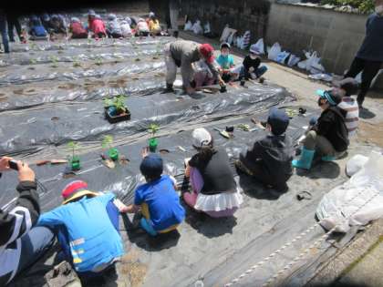 今日は,晴天に恵まれ,暑いくらいの気候の中,明徳農園での苗植えをしました。学校から畑に向かう道で「先生,畑に行くの久しぶりだね〜」と,子どもたち。昨年度冬野菜を収穫し終わってから行ってなかったので,久しぶりの明徳農園に子どもたちはウキウキしていました。