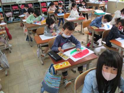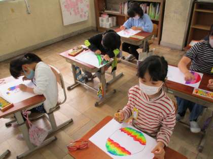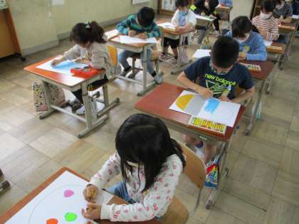 図画工作の学習で「ふしぎなたまご」を描きました。たまごが割れた中からどんなものが出てくるのか想像しながら,たまごの色をパスで塗りました。