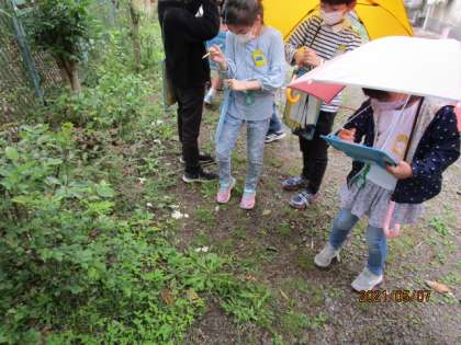 4年生の理科『春の生き物』の中で,中庭で春の生き物探しをしました。当日はあいにく雨が降っていましたが,子どもたちは目をキラキラさせながら,春の生き物探しをしていました。