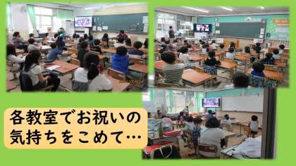 5時間目に1年生を迎える会を行いました。緊急事態宣言中ということもあり,全校で体育館に集まって1年生をお祝いすることはできないので,各学級で作成した動画を観てお祝いをしました。短い時間でしたが,温かい会となり,1年生に「仲良くしようね,おめでとう」の気持ちを届けることができました。また,1年生からありがとうの気持ちがこもった可愛らしいお返しの動画もありました。全校のみんなで仲良くしていきたいなと思います。会は,放送室より児童会本部の子たちが司会進行を立派に務めてくれました。