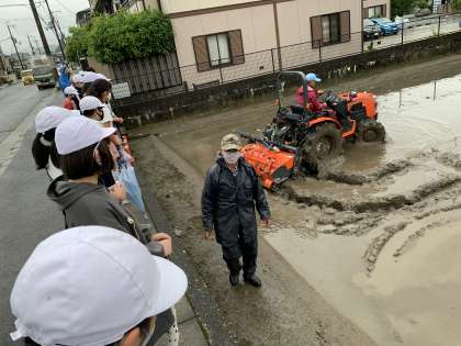 今日は,あいにくの雨の中「本ごなし」を見学しました。あぜぬりの前に行ったあらごなしと同じような作業でしたが,細かな違いがありました。