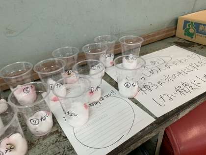 植物の発芽と成長の学習をしています。今日は5年生になって初めての理科室での授業でした。植物の発芽の条件について考え,教室にもインゲン豆の種を条件を変えながら置いて観察中です。子葉が出てきたものも…。このまま観察を進め,発芽するためには何が必要か,確かめていきたいと思います。