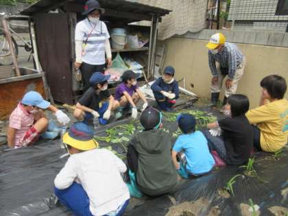畑の先生にご協力いただき,明徳農園にサツマイモの苗を植え付けました。