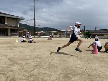 今日の天気は晴れ。ということで先週は雨で全くできなかったリレーを久しぶりにすることができました。今日はバトンパスの練習をして,実際に走ってみました。久しぶりに走ったということもあり,子どもたちの楽しそうな笑顔がとても印象に残っています。