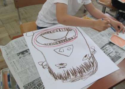 6月4日はむし歯の日なので,歯みがきをしている自分の絵を描きました。鏡でじっくり見てから,画用紙いっぱいにクレパスと絵具で描きました。次の時間に歯ブラシを作って張れば完成です。大きくて表情豊かな自画像に仕上がりそうです。