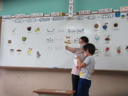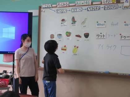 英語で好きな食べ物を聞いて答える練習をしました。(星の子)
