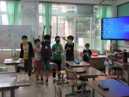 まず,出題する子が好きな食べ物を3つ選んで英語で発表しました。次に一番好きな食べ物をクイズにします。ほかの子どもたちは,予想した食べ物のカードのところに集まって,英語で聞き,答えを待ちます。発表のたびに大盛り上がりの教室でした。