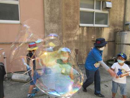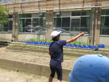 外へ出て実際にシャボン玉を作ってみると,確かに,洗濯のりやガムシロップが入っている液の方がシャボン玉をうまく作れました。また,穴の開いているフライ返しや,牛乳パックを切ったもの,餅焼き網などでもシャボン玉ができて,またまたビックリ。みんな,だんだん上手になって,大きなシャボン玉ができた時には歓声があがっていました。