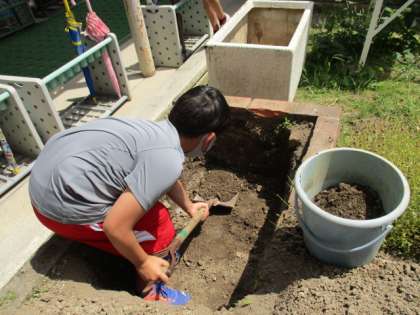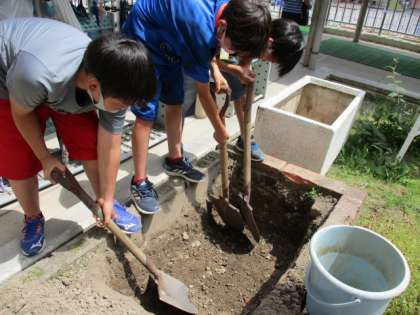 今週から作業が始まりました。花壇の一部を深く掘っています。管理用務員の白神さんの力をお借りして・・・さあ何ができるのでしょうか。答えは後日,ホームページでお知らせします。