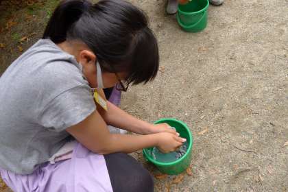 家庭科「夏をすずしくさわやかに」の単元で,洗濯の実習を行いました。手洗いで洗うことが初めてという子がとても多く,戸惑っている子もいましたが,学習したようにもみ洗いやつまみ洗いに一生懸命挑戦し,自分の靴下を丁寧に洗っていました。感染症対策で一人ひとりの洗面器や桶で洗いました。子どもたちの気付きでは「洗ってみて布と布を合わせてこするようにするとよく汚れが落ちた」「洗濯機より洗ったという実感が持ててよかった」などがありました。この学習をきっかけに,手洗いの良さや自主的な衣類の管理について考えることができるといいなと思います。