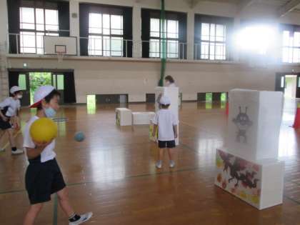 体育のボール運動で「なかあて」をしているのですが,なかなかボールのコントロールが上手くいかない子が多かったので,まとあてゲームをしてねらったところにボールを投げる練習をしました。まとには子どもたちがよく知っている悪者キャラクターや青おにが貼ってあったので,始まる前から興味津々で,やる気満々の子どもたちでした。まずは,いつもの自分の投げ方で,当たりそうな距離で次々に投げていきました。ボール投げが得意な子も苦手な子も,キャラクターが倒れるたびに大喜びでした。来週は,上投げや距離を離してなど,一人一人に合ったレベルアップを少しずつしていきたいと思います。