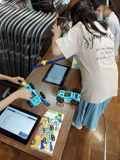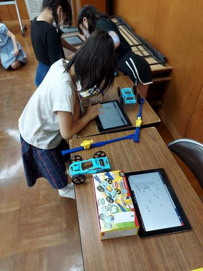 理科「ゴムや風の力」では,ゴムの力で車を動かしました。5cm,10cm,15cmの時にどのように距離が変わるのか実験しました。実験結果をタブレットを使って共有しながらすることで自分の記録と友だちの記録を比較しながら実験することができました。