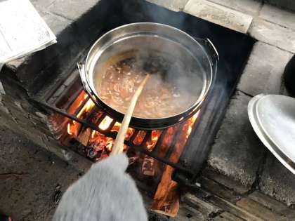 カレーとご飯を火にかけます。なかなかいいところに火が当たらず、火加減も思うようにいかず、大騒ぎでしたが、おいしそうなカレーとご飯ができあがりました。
