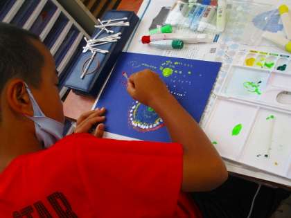 前回は歯ブラシでスパッタリングをしましたが,今回は綿棒に絵の具をつけて点描という方法で思い思いの花火を作りました。