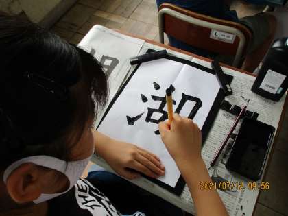 毛筆の学習をしました。学習課題は「3つの部分の組み立て方に気を付けて書こう」で『湖』を書きました。組み立て方の最適なバランスを考えながら練習をしました。『月』の左はらいに注意をしたり,「さんずい」の点画のつながりや文字の大きさにも注意をしたりしました。心を整えて自分の字と向き合い,納得がいくまで思いを込めて丁寧に書きました。