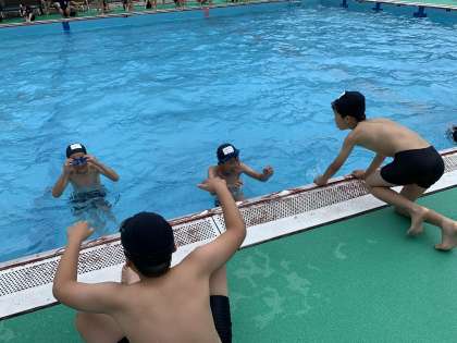 今日は1組と3組が水泳をしました。今できる泳ぎで長く泳ぐ,少し頑張ればできそうな泳ぎに挑戦するなど,一人一人が短い時間の中で考えながら臨んでいました。あと一回の水泳の授業です。みんなで晴れを願いましょう!