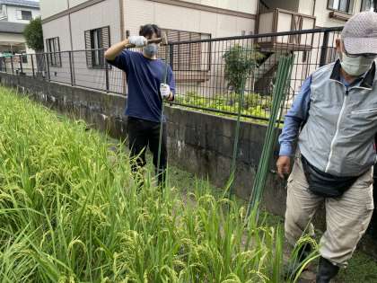 田んぼの様子を見に行きました。連日の雨のおかげもありすくすくと成長しています。成長を待っていたのは私たちだけではありませんでした。スズメやハトたちもおいしそうな米を狙っていました。そこで,畑の先生方にご協力をいただき鳥除けテープを張りました。来月は稲刈りをする予定ですので順調に育ってほしいですね。