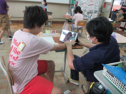 最後は,自分で撮った自分の顔の写真に,タブレット用のペンを使って,名前や好きな物などを書き込み,自己紹介の画面を作りました。さらにそれを,先生のタブレットに送ることもできるようになりました。子どもたちは,とても楽しそうでした。