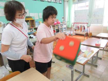 生活単元「みんなであそぼう」では,すごろくをみんなのアイデアで作って,遊んでいます。1人で1つのマスを担当して「○○のまねをする」とか「△△を歌う」とか「3つ進む」など楽しく工夫したお題を書いてすごろくに並べます。順番にさいころを投げて,出た数だけ進むのですが,どんなお題が出ても大喜びの教室です。しっかりソーシャルディスタンスをとってたのしく学習しています。