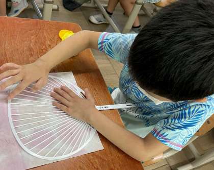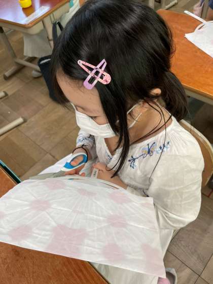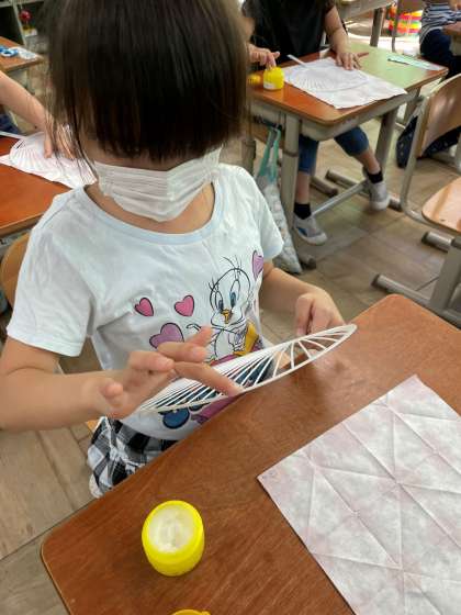 のりを塗ったり,はみ出たところを切ったりという活動に一つひとつ丁寧に取り組みました。自分だけのオリジナルうちわができてとても嬉しそうでした。