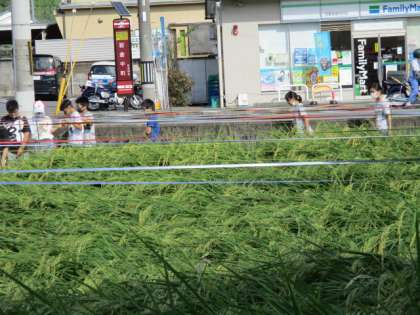 先週,畑の先生から連絡をもらい,5年生は田んぼの様子を見に行きました。「え・・・なんでこんななるん。」と子ども達。ついこの前まで「元気に大きくなってる!」と大喜びだったのに。感想を読むと「悲しい。夏休みもずっと見てきたのに。」「これってどうなるんだろう。風や雨ってここまで力があるの?」「心配です。稲刈りできるのかなあ。」とありました。