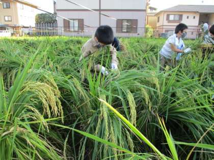 この前,畑の先生と学校の先生たちで起こしたもち米でしたが…また倒れてしまっていました。田んぼの近所に住むAさんは「気になってるねん。」,農業に詳しいSさんは「地面についてしまったらすぐ発芽する。」と,それぞれ心配していました。「よし!今度は自分たちで起こしに行こう!」と,今日の放課後に有志メンバーが集まり,作業をがんばってくれました。どうか稲刈りの日まで無事でありますように。保護者の皆様も急な服装等のご準備ありがとうございました。