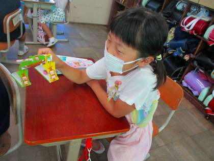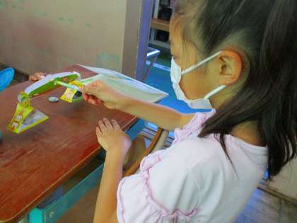 そこで,教科書のうらについている紙の天秤を使って重さを比べます。