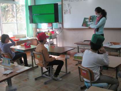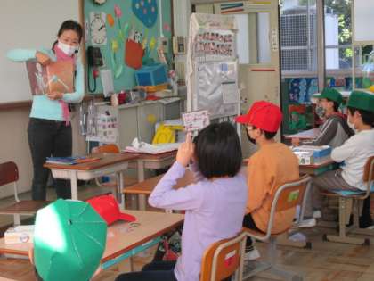 今日は図書ボランティアの方に読み聞かせをしていただきました。色鮮やかな魚や動物やがい骨など子どもたちになじみのあるものが,模様や形をすこし変えてあることを英語で表現してある絵本でした。子どもたちは,耳からも目からも英語に親しむことができ,楽しい時間を過ごさせていただきました。ありがとうございました。
