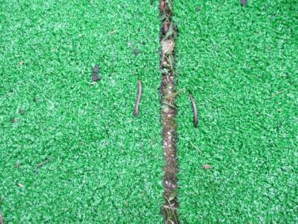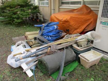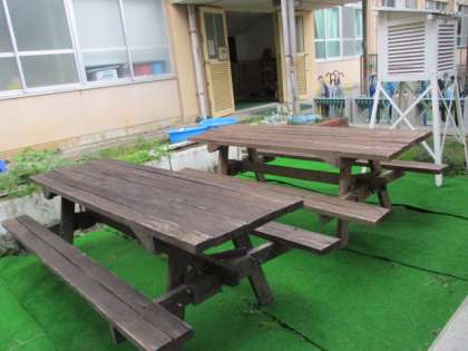 倉庫の整理をしてみると,不用品がたくさんでてきました。しかし,よく見ると「これ使えると思うよ。」と管理用務員さん。ゴミの山から宝を発掘!これこそ「リユース」です。中庭のコーナーが,人工芝が敷かれ,パッと目をひく場所になりました。そして,よくよく見ると,「この留め具もあったような・・・。」そうです。これも不用品の中にあったものを切って曲げて作ったそうです。ありがとうございます。