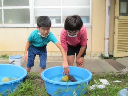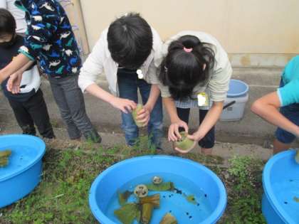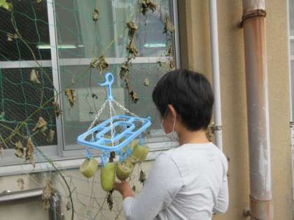 ヘチマの皮をむきました。湯がいたヘチマの皮は意外と柔らかくスルッとむけるので,初めは恐る恐る触っていた子どもたちもいつの間にか夢中になっていました。きれいにむけたヘチマを干して,出来上がるのが待ち遠しい星の子たちです。