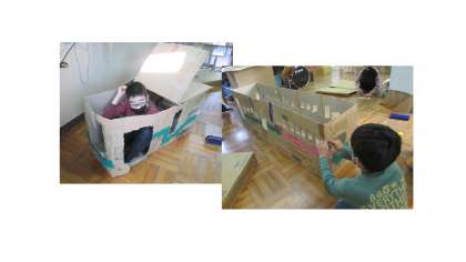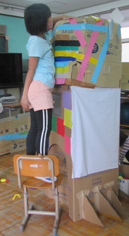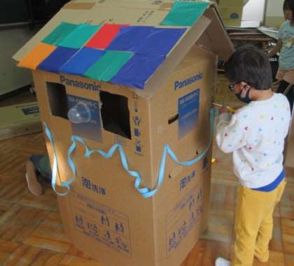図工の時間にダンボールアートに挑戦しました。星の子の子どもたちは,楽しく遊びながら制作し,発想がどんどん膨らんでいきました。町の電気屋さんでいただいた洗濯機や冷蔵庫の巨大なダンボールでは,積んだり切ったりして,お家やロケットや自動販売機を作りました。ドラッグストアやスーパーでいただいたトイレットペーパーや野菜のダンボールからは,つなげたり組み合わせたりしてバスやままごとセット,ベッド,王様のイスなどが出来上がりしました。子どもたちの中には遊びながら,「おうちに持って帰ってきょうだいと遊ぶ」とはりっきっている子もいましたが,さあ,どうやって持ち帰りましょうか・・・
