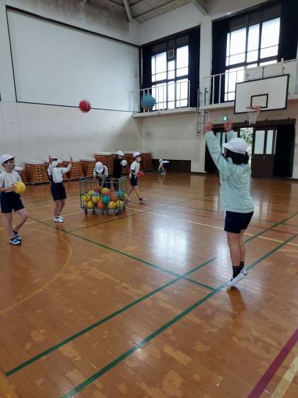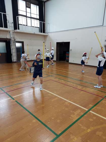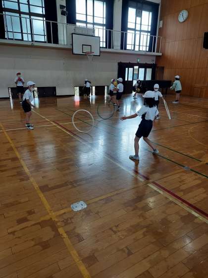 体育科の「用具遊び」では,棒やフラフープ,ボールを使って活動しました。それぞれを友だちと協力して工夫しながら使い,楽しんで活動することができました。