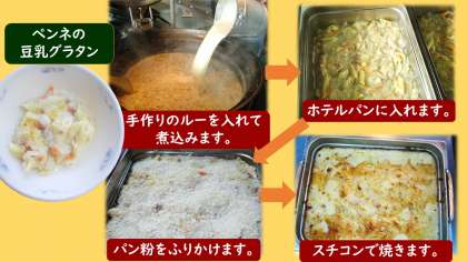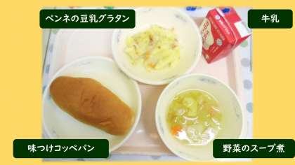 ペンネの豆乳グラタンは,手作りのルゥで具を煮込み,スチームコンベクションオーブンでこんがりと焼きました。みんな楽しみにしていた献立の一つです!