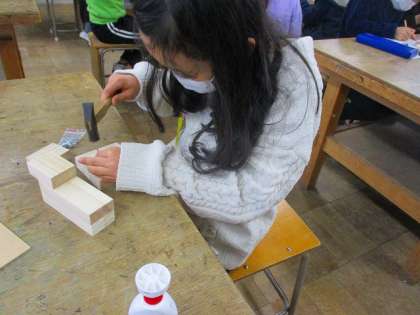 図画工作で「くぎうちトントン」の学習をしています。金づちやげんのうを用いてくぎを打ちつけ作品を仕上げようと試みているところです。