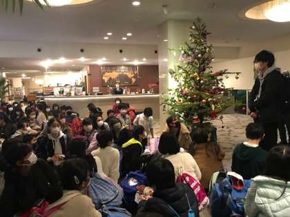 ホテルに到着しました。長いバスの旅で寝起きの人もありましたが,入館式には,しっかりと臨むことができました。部屋で身辺整理をして19時から楽しみにしていたお食事です。