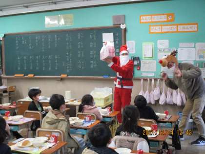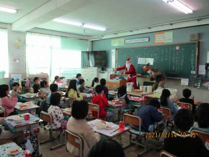 鈴の音と音楽とともに,給食時間にサンタさんとトナカイさんがチョコレートケーキを全教室に運んできてくれました。明徳小では恒例行事で子どもたちは毎年楽しみにしてくれていますが,1年生は初めての経験で何事かとびっくり!どの学年もとても喜んでくれました。サンタさんとトナカイさんが届けてくれたケーキを美味しくいただきました。