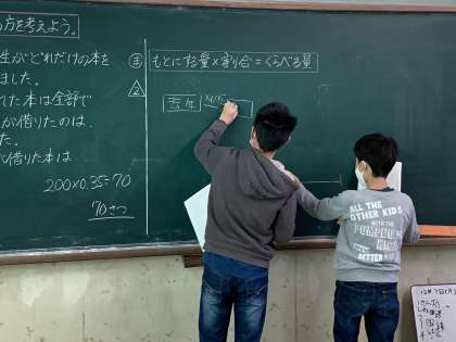 割合の学習を進めています。今は割合を求める問題,もとにする量を求める問題,比べる量を求める問題と,パターンが決まったものの学習とあって,関係図を使うことでクリアしています。苦手な子も仕組みを理解することで手を挙げられるようになってきたので,とても良い傾向です。この調子でどんどん突き進んでいってほしいです!