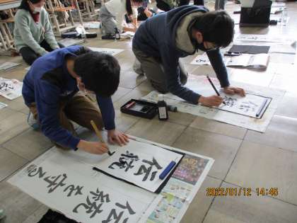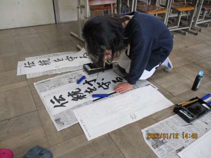 今日は3学期になって初めての書写の学習(書き初め)を行いました。「伝統を守る」を画仙紙に書きました。普段の半紙とは異なり,幅が狭く長さのある紙で床に置いて書いたので,いつもとは異なる姿勢で難しそうにしている子もいましたが,文字の大きさや中心線を意識しながら丁寧に書きました。雪が降ったりやんだりする凛とした空気の中でしたが,集中して自分の字と向き合っていました。