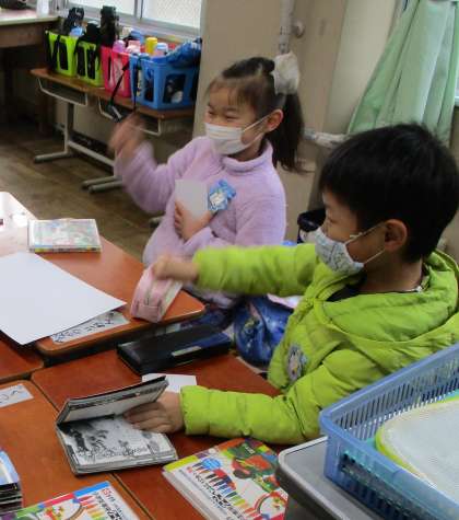 国語科「ものの名まえ」では,グループに分かれてお店を作り,お店屋さんごっこをしています。お菓子屋さんや,洋服屋さん,魚屋さんなど,実に様々な種類のお店が開かれそうです。看板や商品を作るに一生懸命な子どもたち。本番がとても楽しみです。
