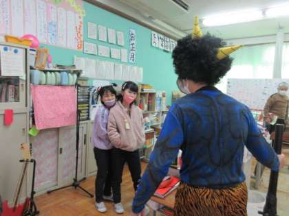 朝の会をしていると,廊下の方からドンッドンッ!と音がして,赤鬼・青鬼が教室にやって来ました。子どもたちは鬼がとても怖かったのですが,勇気を出して鬼に向かって豆をまきました。